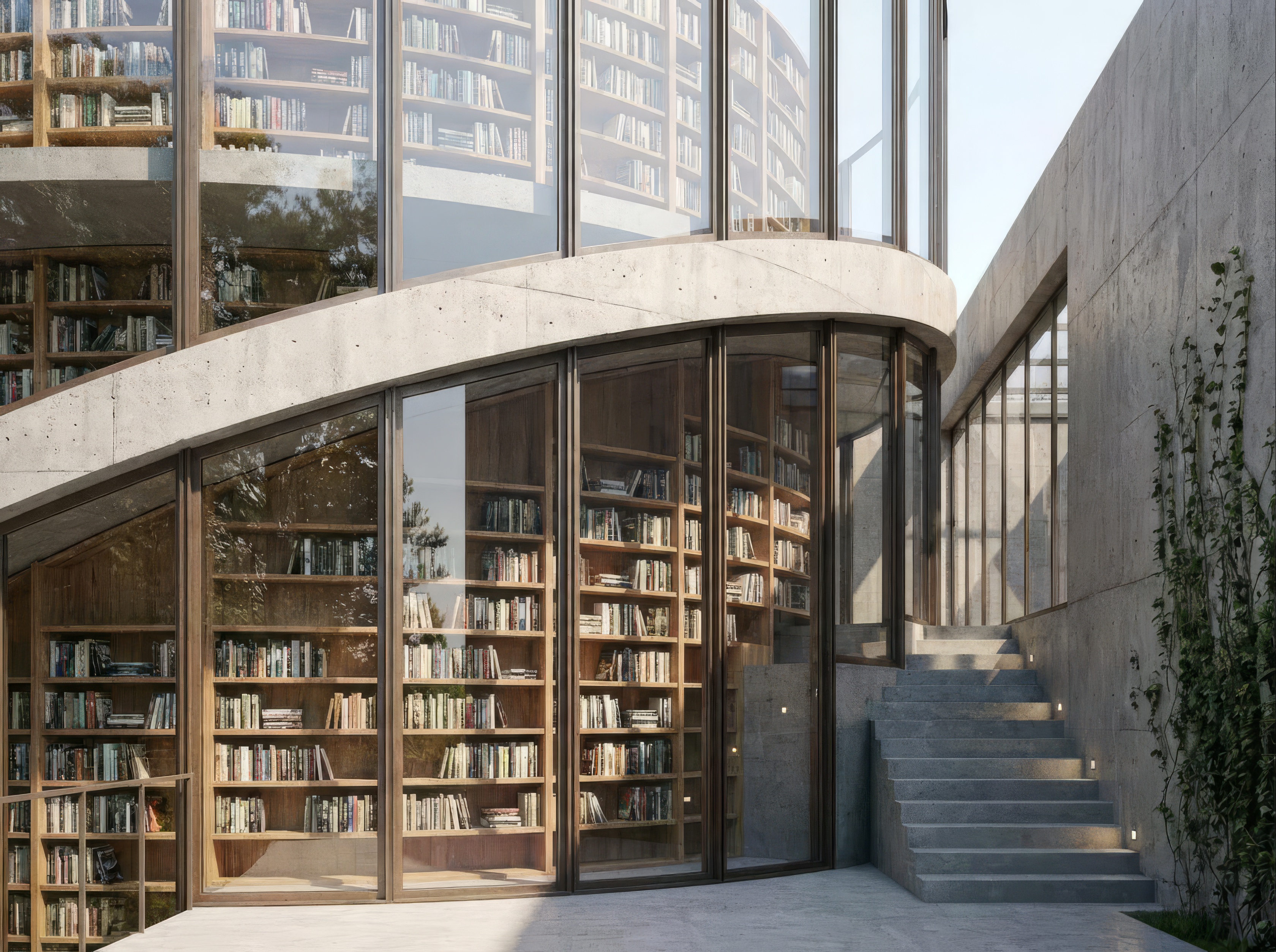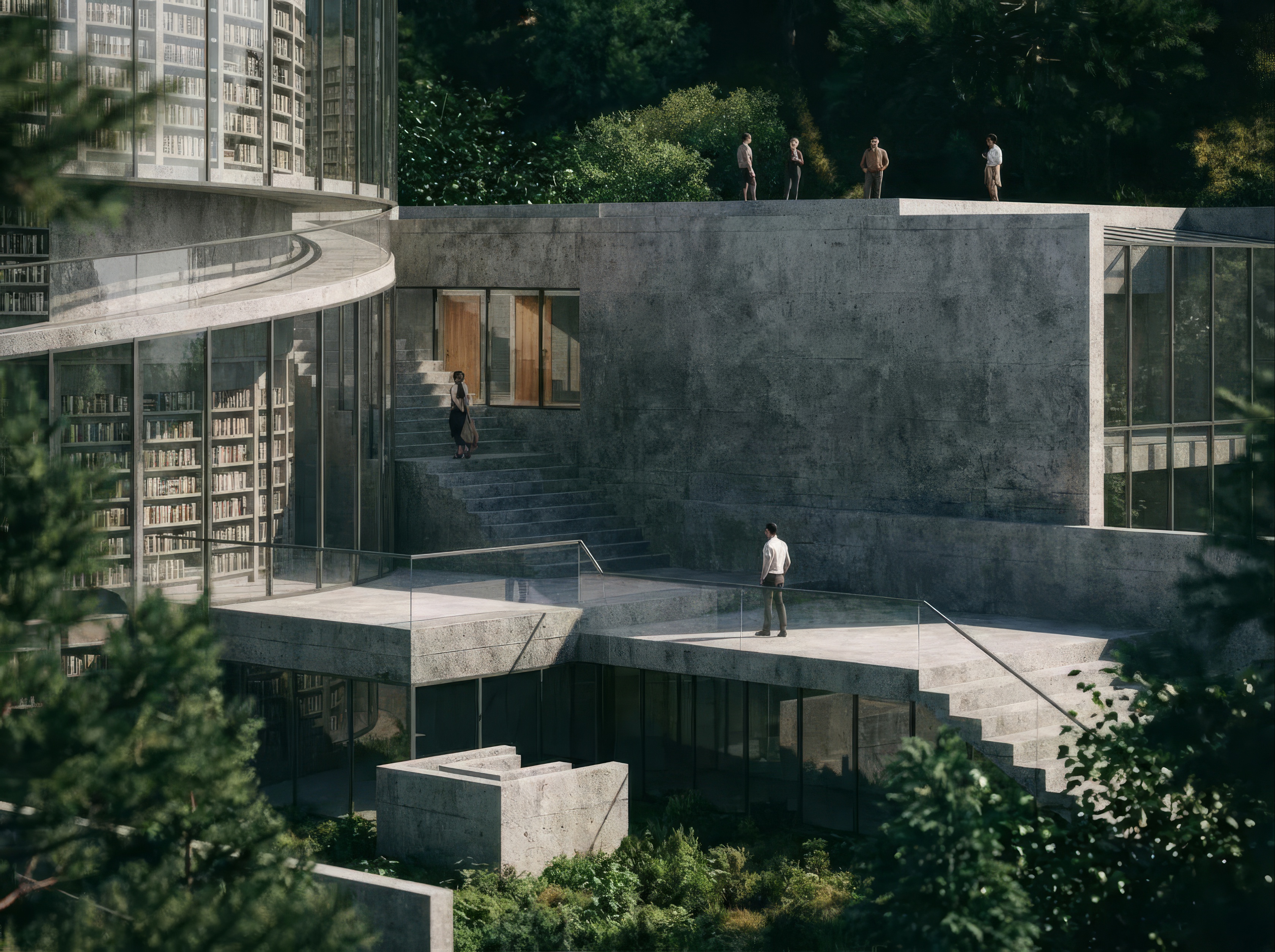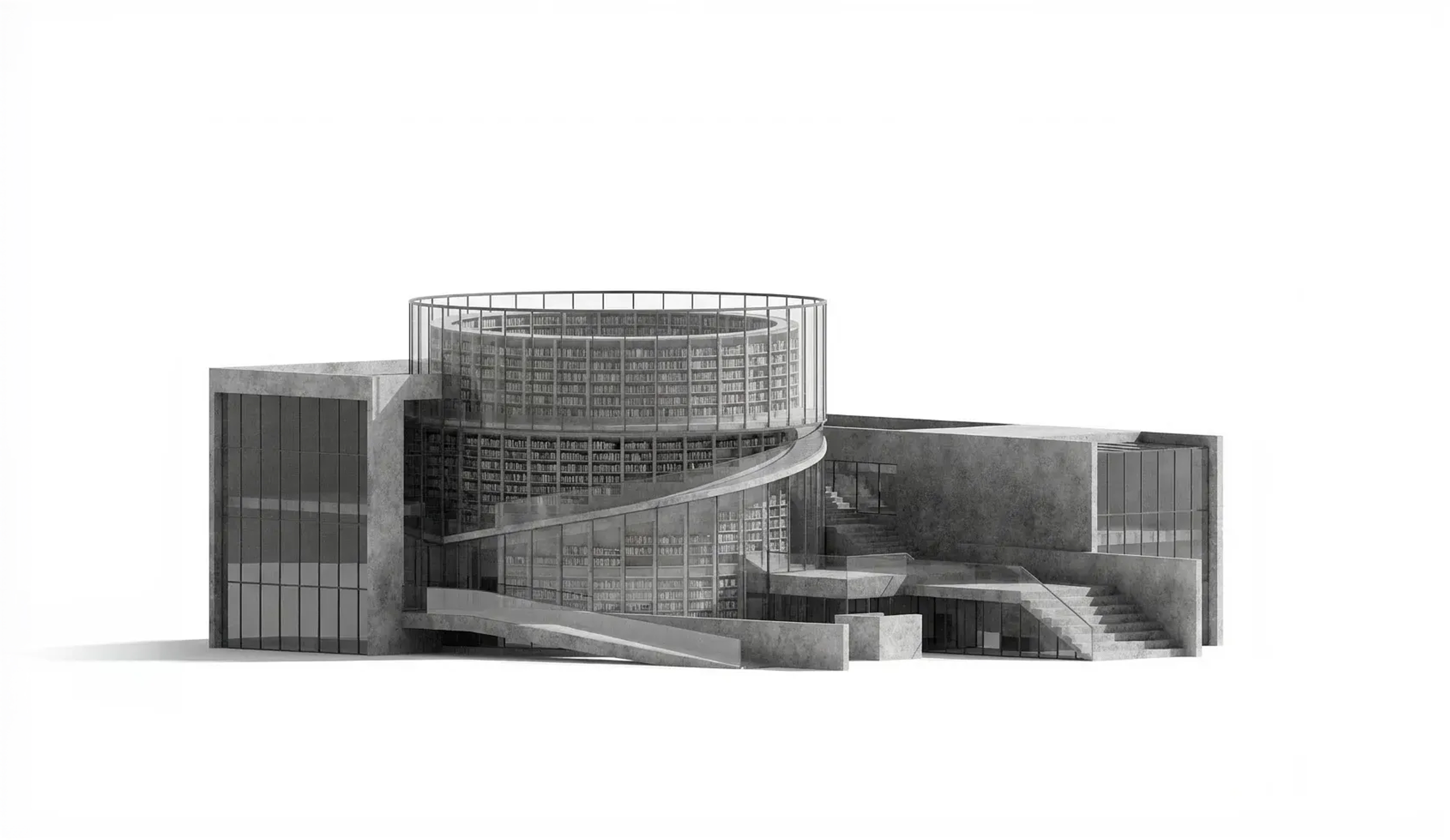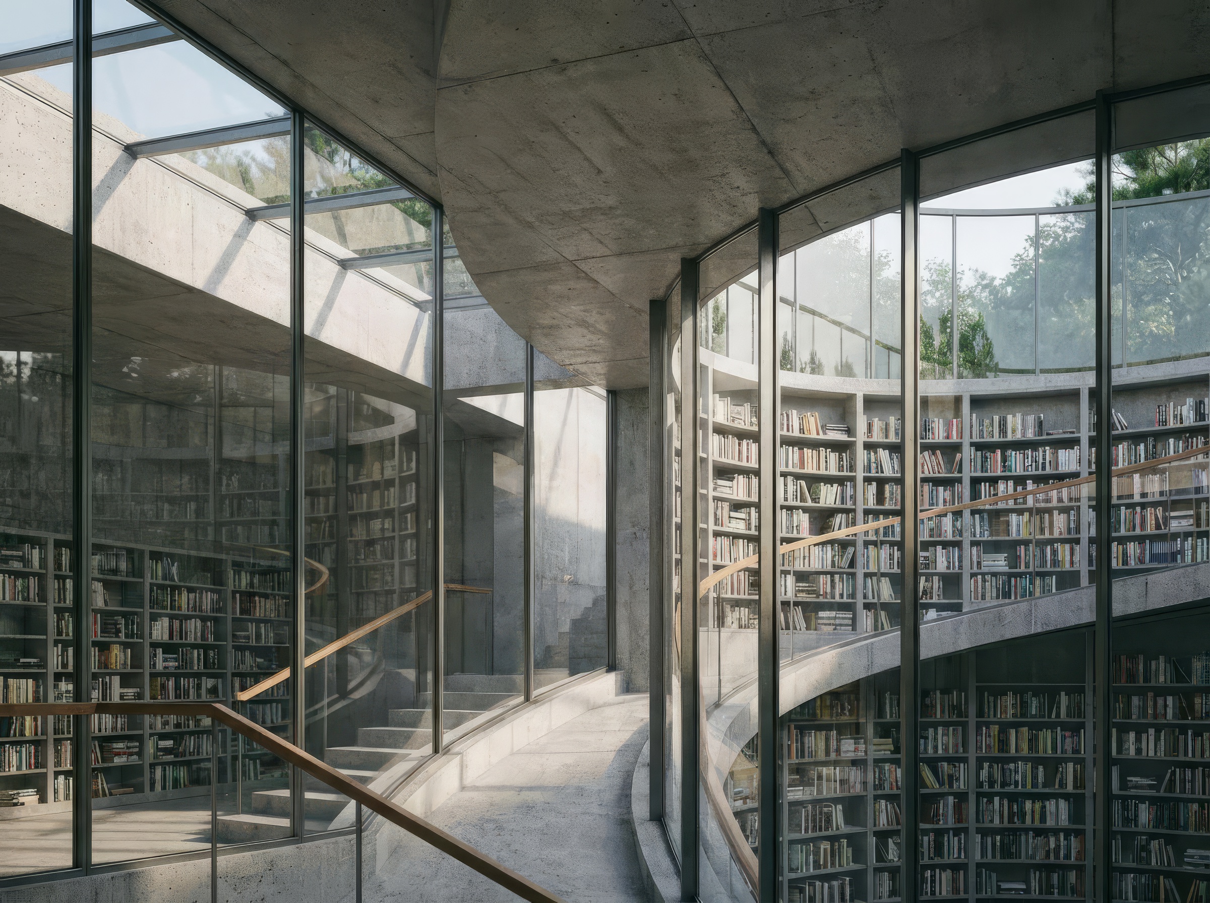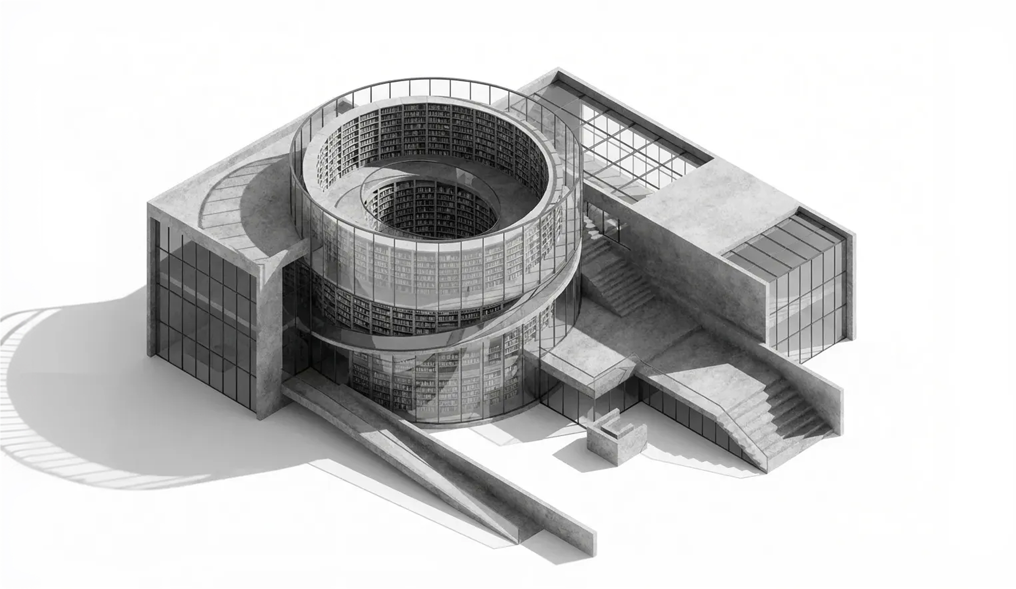 The building is organized around a central reading room bathed in north light from a dramatic clerestory. Smaller program elements - children's area, maker space, community rooms — wrap the perimeter, each with direct access to outdoor reading gardens.