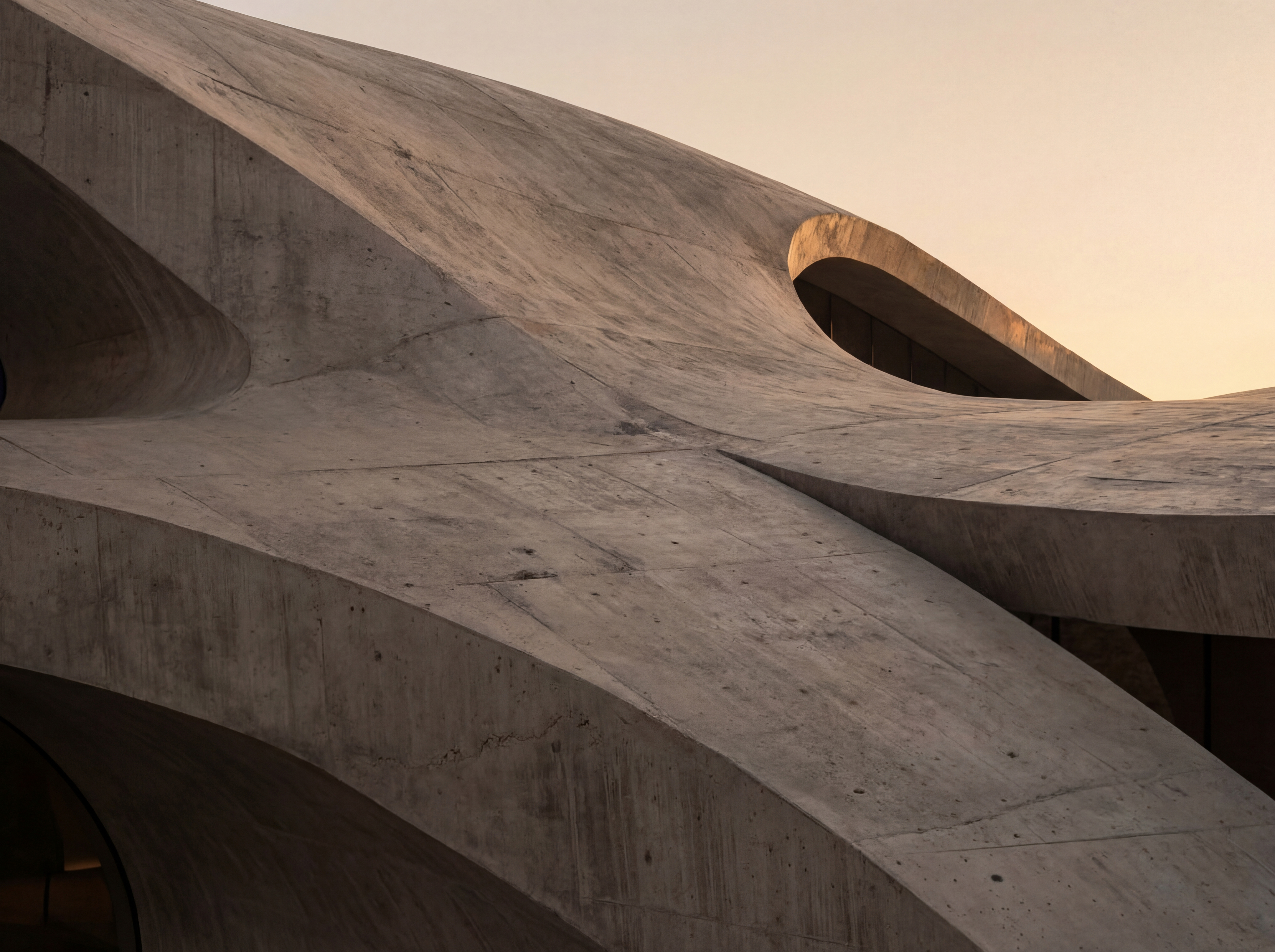 The building’s exterior is cast‑in‑place concrete, its gently textured surface echoing the striations of the surrounding rock. At dusk, warm indirect lighting washes the soffits and underside of the cantilevers, transforming the silhouette into a soft lantern along the ridge line. Inside, a restrained palette of limestone, tinted plaster, and pale upholstery focuses attention outward to the horizon. Curved glazing is high‑performance and lightly framed, with concealed tracks that allow large panels to pocket away during temperate evenings. Roof openings bring shafts of daylight deep into the plan and frame views of the desert sky at night. Integrated wind baffles, shaded outdoor niches, and carefully oriented operable panels moderate the harsh climate, enabling comfortable open‑air use even in shoulder seasons.