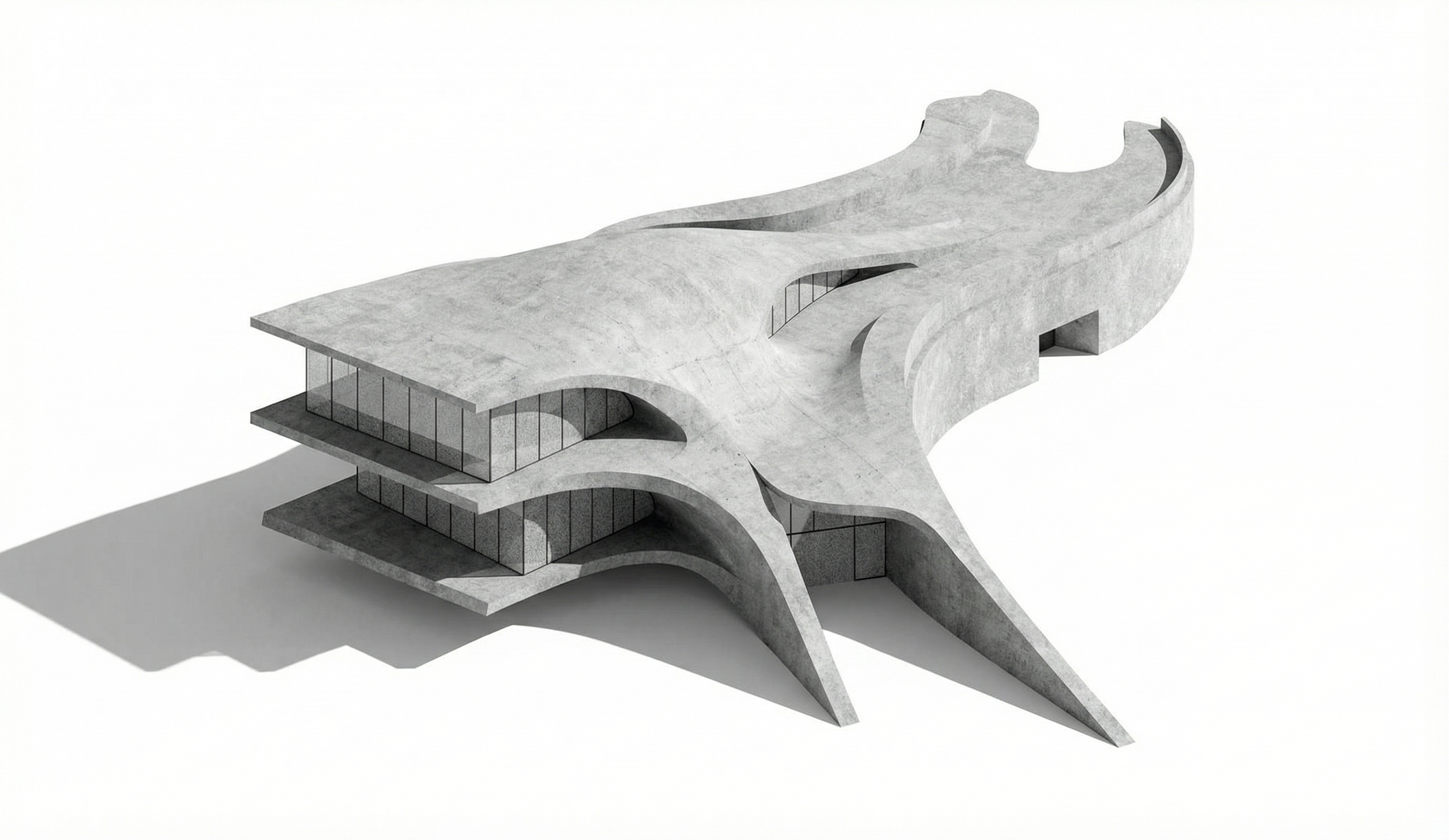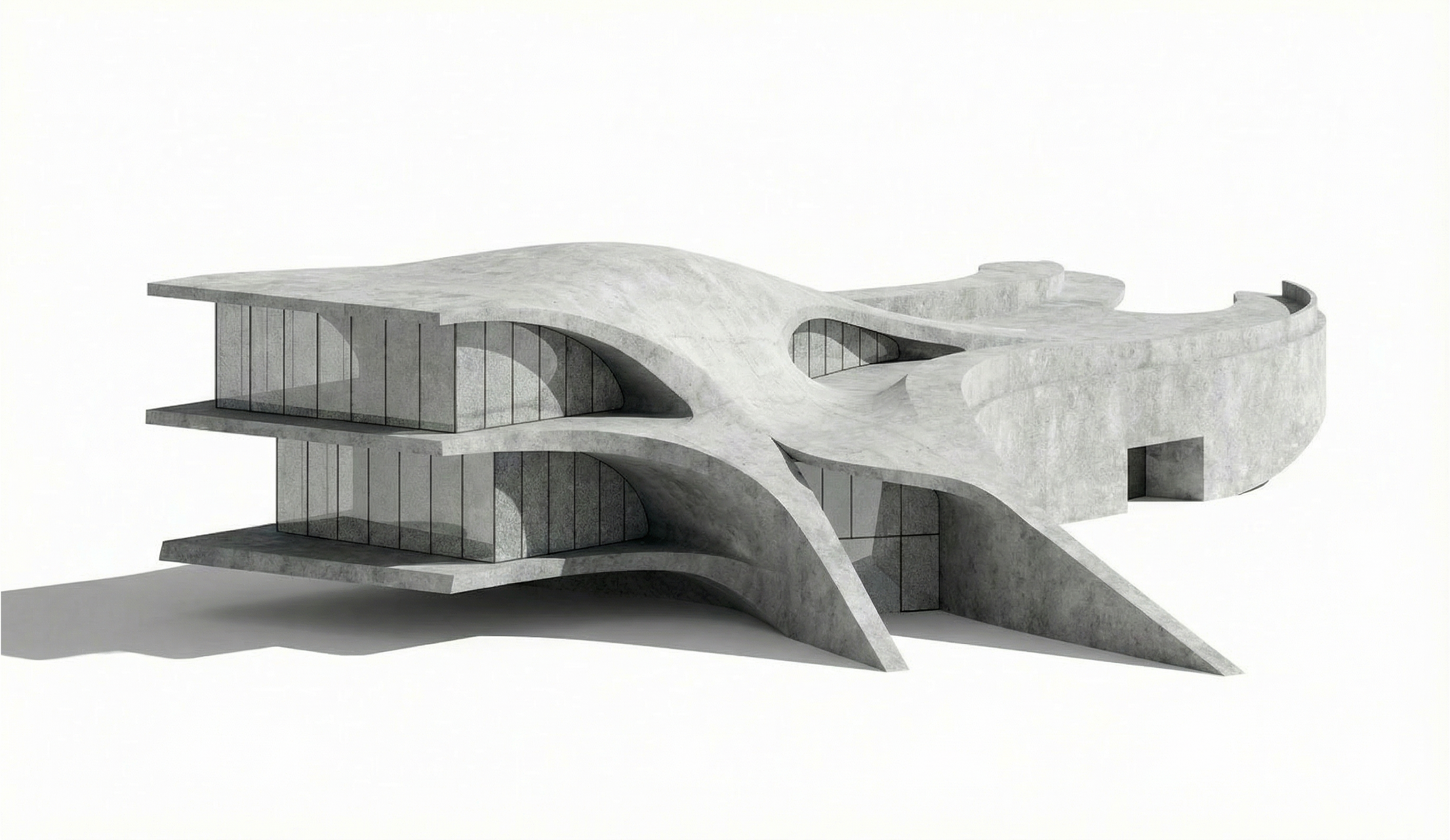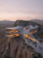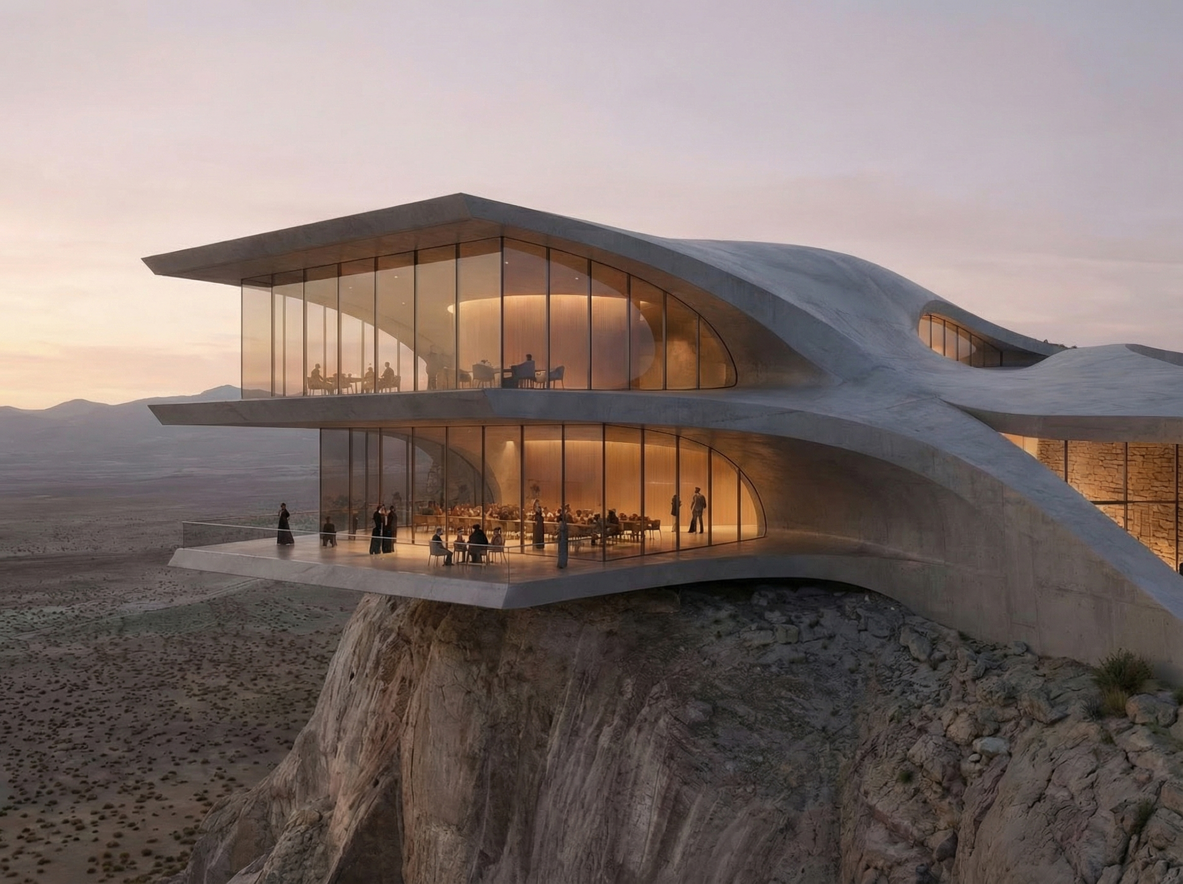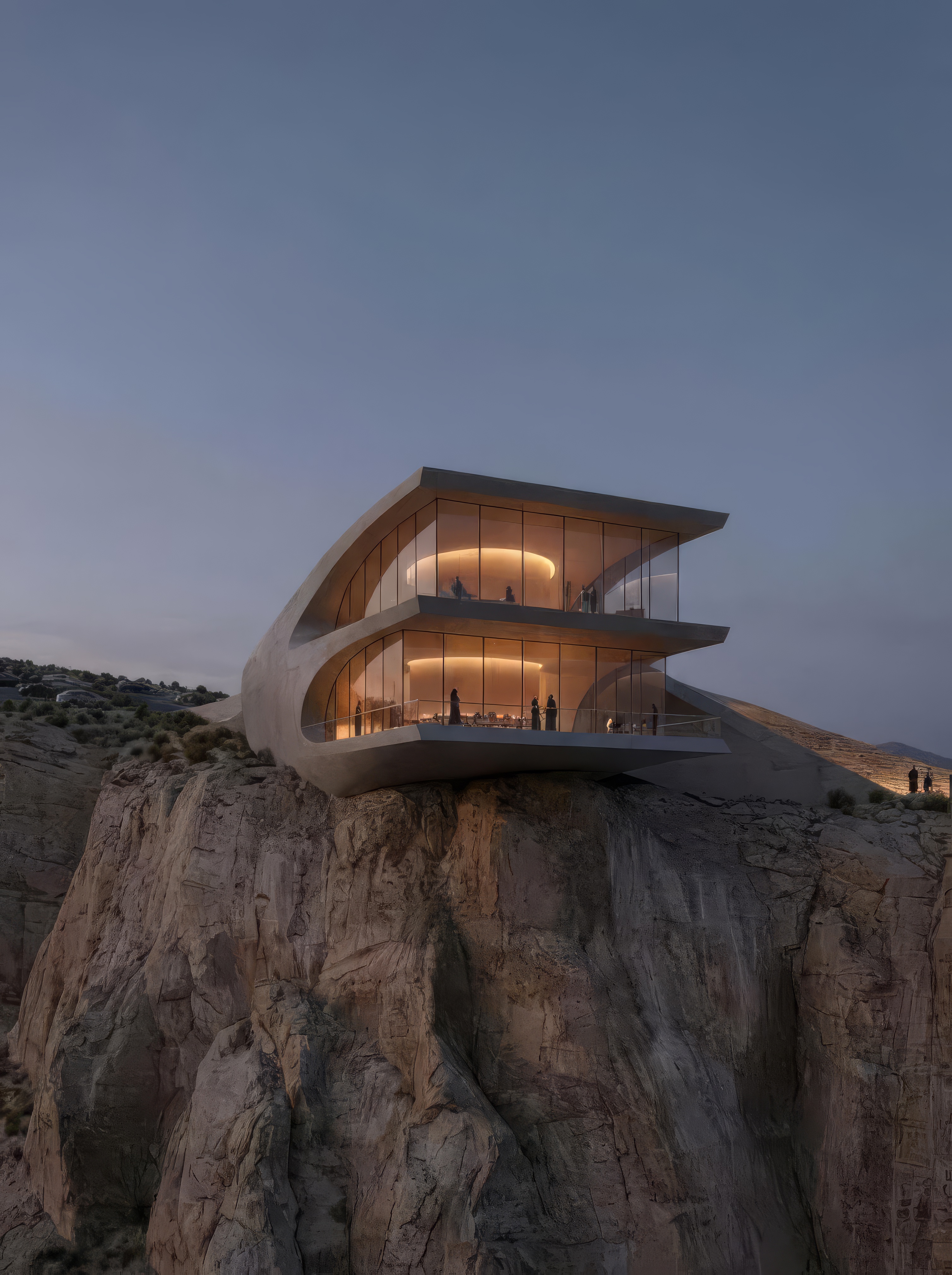 We approached the commission as a landform rather than an object. The roof plane is pulled from the ridge line and folded into a branching concrete promontory that cantilevers over the canyon, creating layered terraces for events and quiet observation. Public circulation traces the edge of the cliff in a continuous loop, gradually revealing panoramic views as guests move from the arrival court to the reception hall to the sky lounge above. A curved glass façade slides beneath the hovering roof, dissolving the boundary between interior rooms and the vast landscape beyond. The structural strategy - post‑tensioned concrete shells and anchored retaining walls - allowed us to keep the floors thin and the overhangs dramatic while minimizing visual supports.