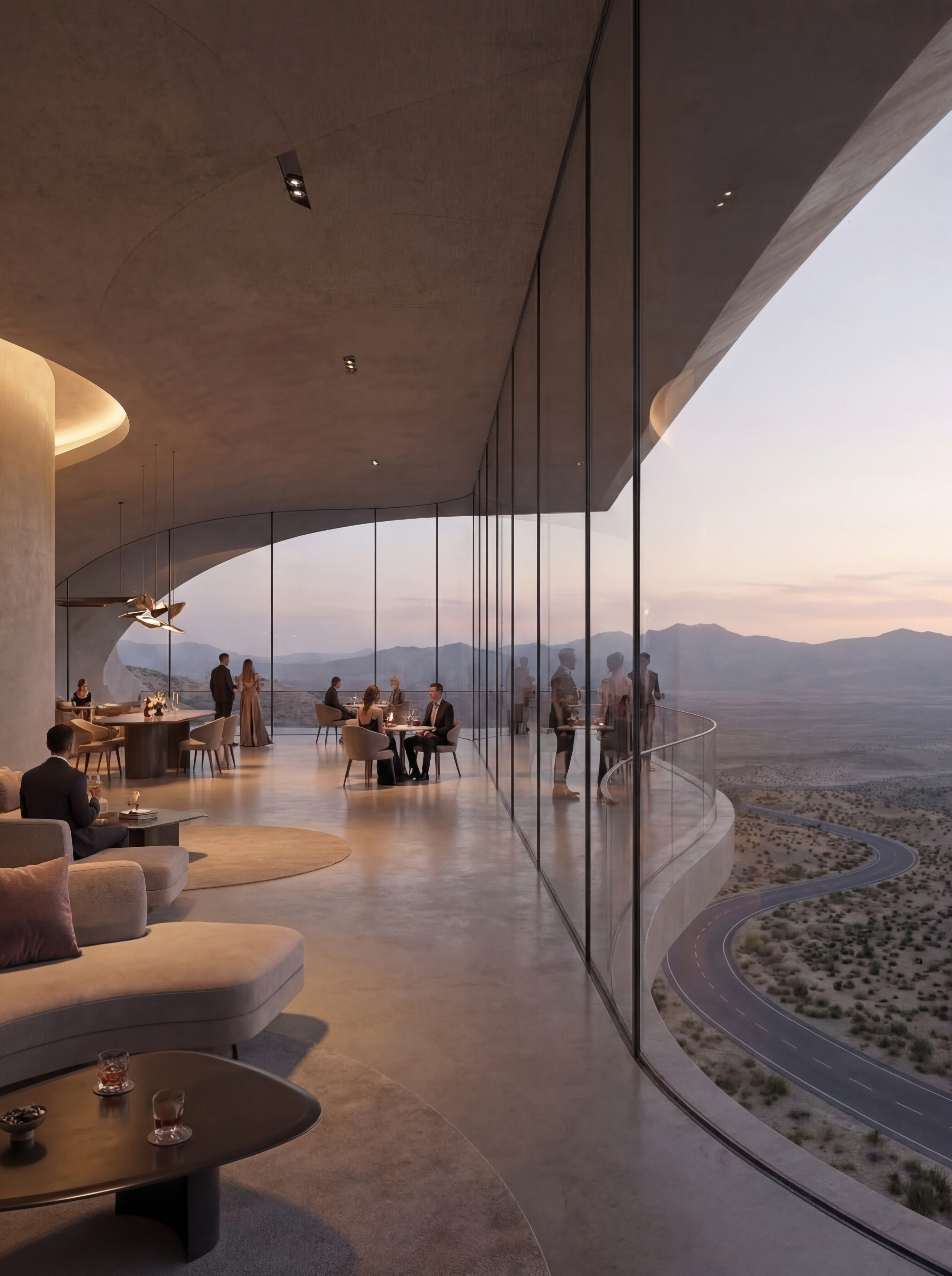 A cliff‑edge event pavilion carved from concrete and glass, The Horizon Promontory offers an immersive perch above the desert: an elevated sequence of dining, gathering, and viewing spaces that extend the landscape out into the sky.